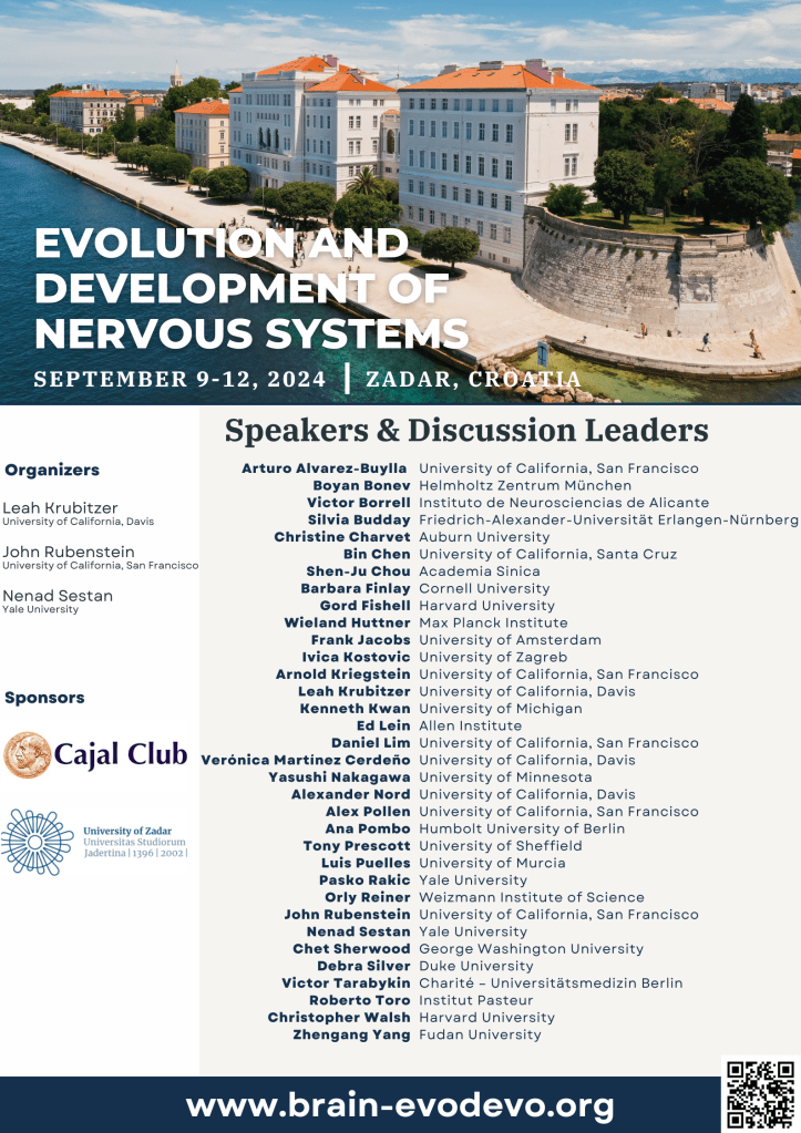 The 2024 Evolution and Development of Nervous Systems will be held at the University of Zadar, Croatia from September 9 to September 12, 2024. The conference will bring together scientists from all over the world who work on brain development and evolution. The conference program includes a diverse range of speakers and discussion leaders from institutions and organizations worldwide, concentrating on the latest developments in the field. In addition to the keynote sessions, the conference will have poster sessions from individuals of all career stages, and shared meals allow for informal networking opportunities with leaders in the field.